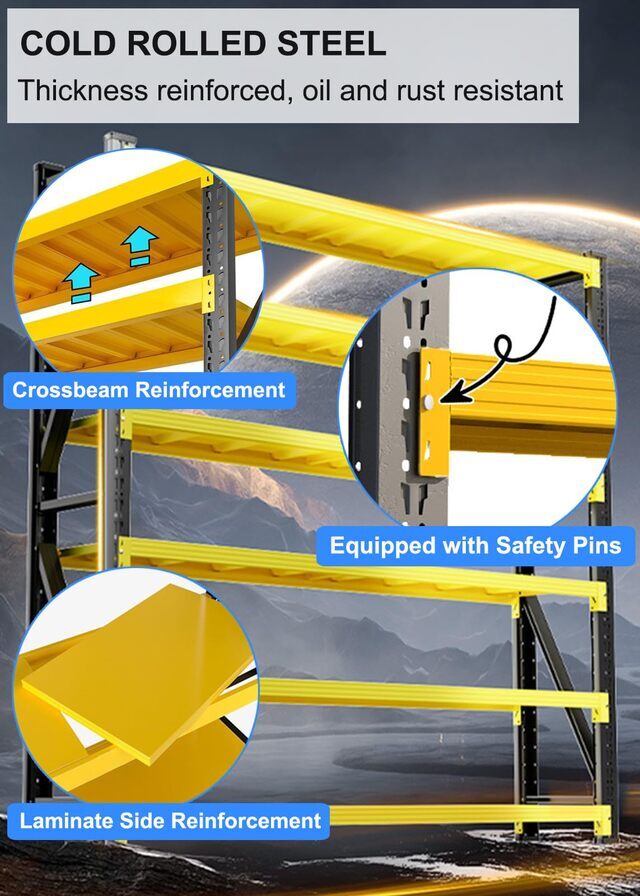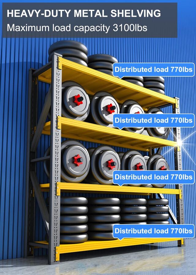 ● Made of the high-quality cold rolled steel frame, this shelving unit is more steadily and tough than normal garage shelves. The maximum capacity is up to 3100 lbs totally, 770 lbs per shelf, which can store much more stuff and tools in your garage or warehouse.